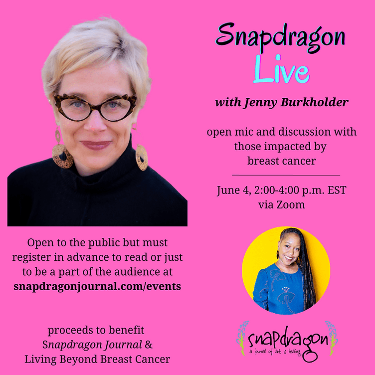 On Sunday, June 4 from 2:00-4:00 pm EST, I will host SNAPDRAGON LIVE, a virtual open mic for those impacted by breast cancer.